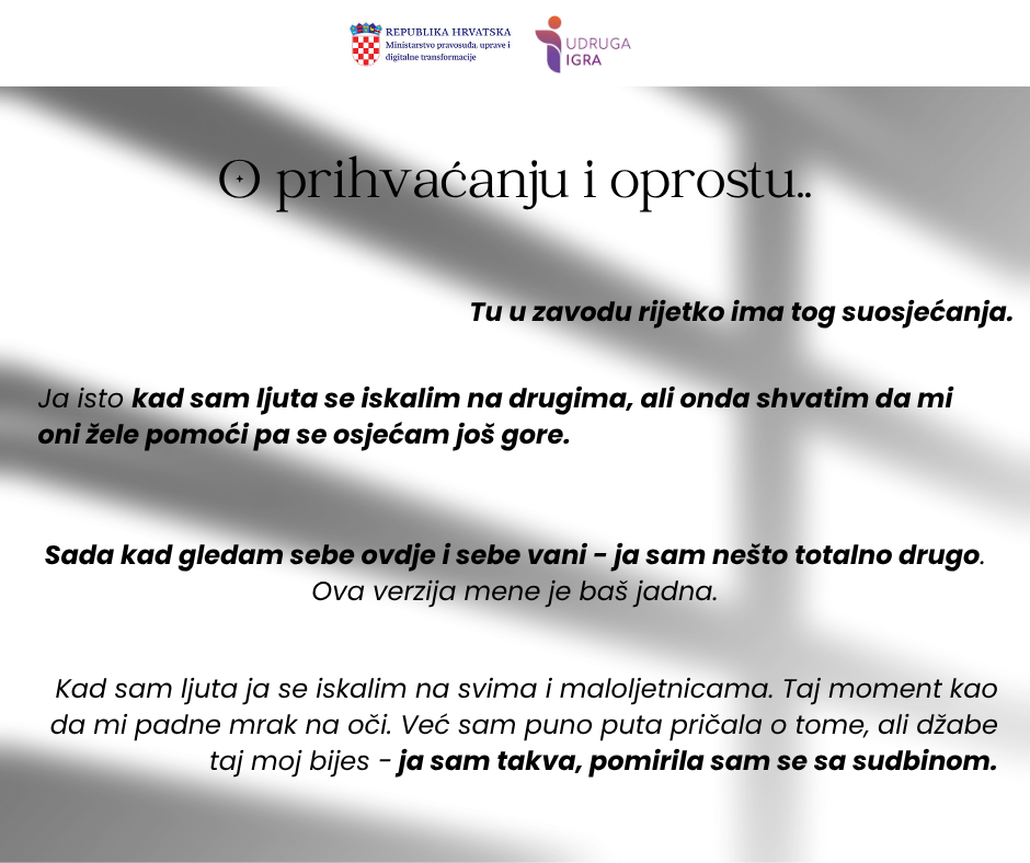 Ove jeseni, kroz ciklus radionica Snaga riječi, imale smo priliku družiti se s djevojkama u Odgojnom zavodu u Požegi. Kroz terapijske priče i promišljanja istraživale su svoje emocije, iskustva, vrijednosti te snove o budućnosti.